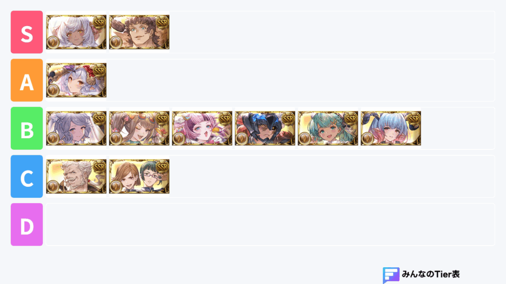 1アビが10回多段アビダメ、ディスペル効果など。2アビが9倍アビダメ、攻防デバフ、命中率ダウン効果などを持つ蛇の咬裂効果を付与。3アビが1ターン敵の行動を封じる封印系デバフと連撃デバフ、命中率ダウンデバフです。サポアビでパーティーの星晶獣の数に応じて、強力な効果を得ます。特に4人で得られる「敵が特殊技を使用時、ダメアビ(1アビ、2アビ)即時使用可能」と5人で得られる「1ターンに同じダメアビを連続2回まで使用可能」が強力です。星晶獣染めしないといけない点が使いづらいキャラではあります。