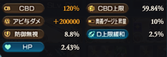 シャルロッテは10ターン目以降、2アビと3アビを連打できます。奥義加速とディスペルが主な役割です。Gゲージ50から発生する隠し予兆の兜率天(TA)に対応するため、過剰にTA率を持っています。久遠の指輪を使っています。もっともHPが減りやすいので、HPと防御は手厚く振っておきます。