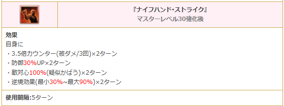 ゲーム内の表記は、いずれも『敵対心UP』という表記です。でも前者は、100%攻撃単体攻撃を受けるのに対して、後者は受ける確率が上下するだけと効果が違います。そこで某攻略サイトの表記を確認してみました。