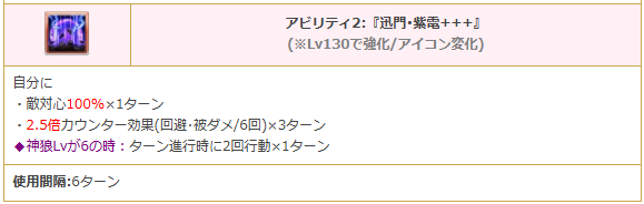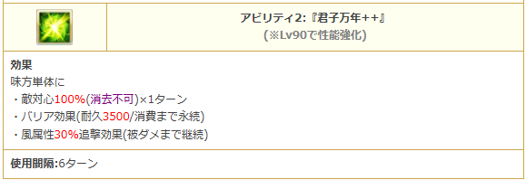 ![]() | 風属性SSRノイシュ 3アビで風キャラ1人に潜伏効果5ターン |
