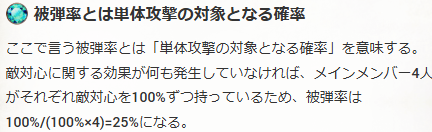 そして被ターゲット率の計算式は、(そのキャラクターの敵対心)÷(パーティーメンバー全員の敵対心の合計)で算出されるとわかりました。