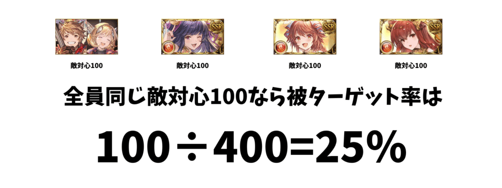 敵対心が100のキャラが4人並んでいると仮定します。先ほどの計算式に当てはめるとこの時1人の被ターゲット率は、100÷(100+100+100+100)=25%です。