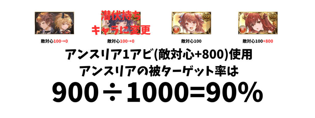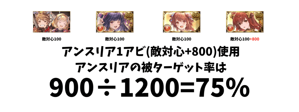こちらのサイトに『+800』と記載がありました。先ほどの計算式に当てはめてアンスリアの被ターゲット率を計算してみます。