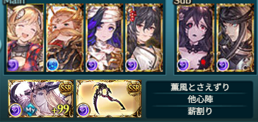 奥義5回と無属性ダメを解除できません。主人公の薫風とさえずりとフレルシで弱体対策をしています。浴衣イルザは40ヒットを確実にクリアするために編成しています。