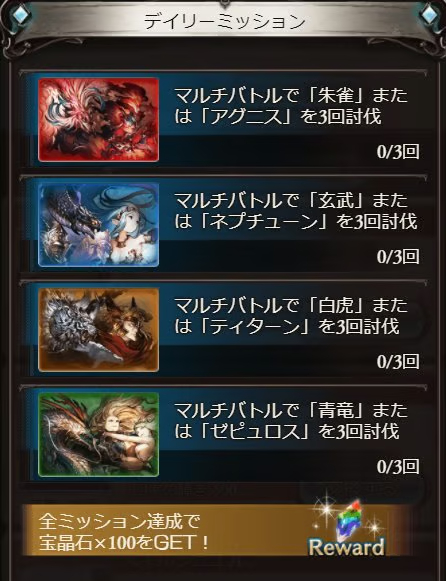 四属性(火、水、土、風)のEX及びEX+を3回ずつクリアすることで、毎日宝晶石100個もらえます。必ずやっておきましょう。