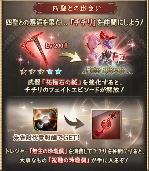 四象キャラは、マグナ武器のスキルの効果量を上げる重要な効果を持っています。いち早く入手したいキャラです。また四象キャラ入手と同時に「四聖の玲瓏佩」「龍心」という各属性の攻撃力やダメージ上限を伸ばしてくれるアイテムも入手できます。