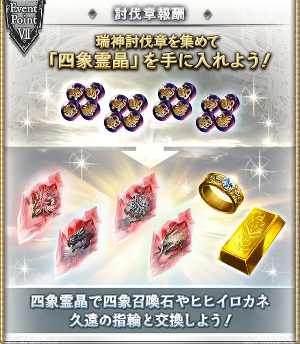 EX、EX+を倒すことで、討伐章、四象の輝きを獲得できます。討伐章は一定数集めることで討伐章報酬を獲得できます。また四象の輝きは、武器やアイテムなどと交換できます。