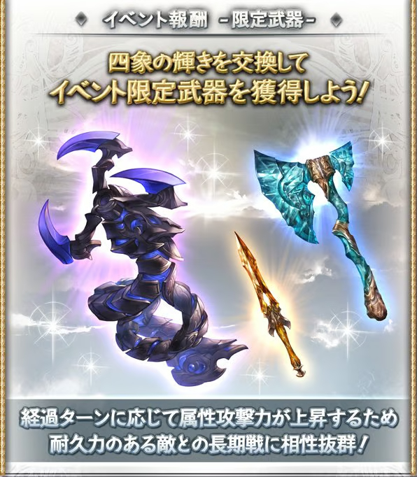 ボーナスタイムが設定されていて、特定の属性の敵から入手できる四象の輝きが増加します。